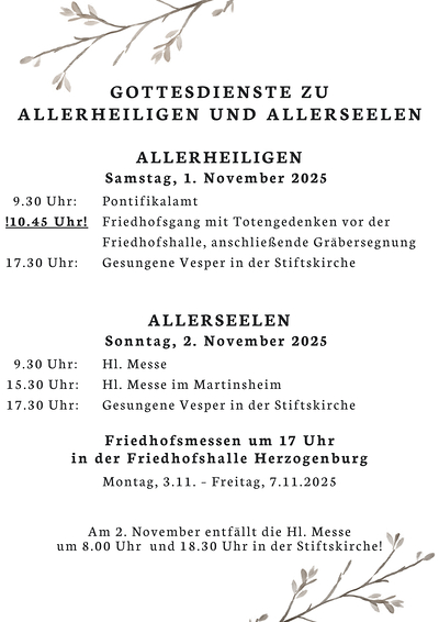 Stiftskirche Montag-Samstag: 7.30 Uhr Sonntag: 8.00 Uhr, 9.30 Uhr und 18.30 Uhr