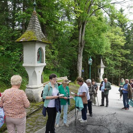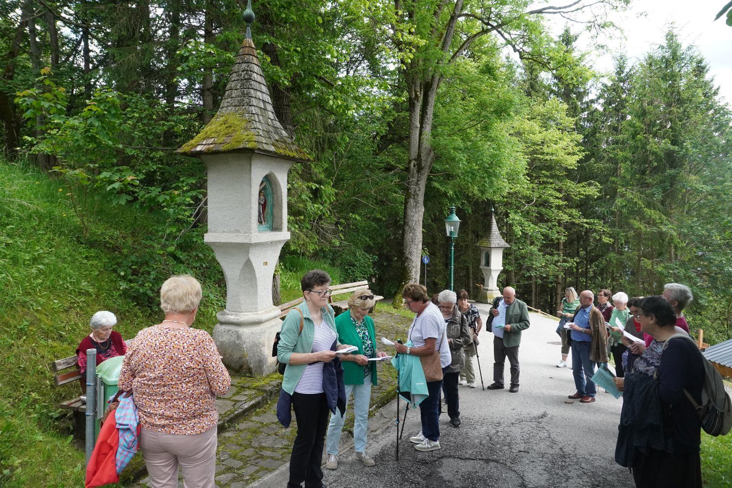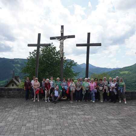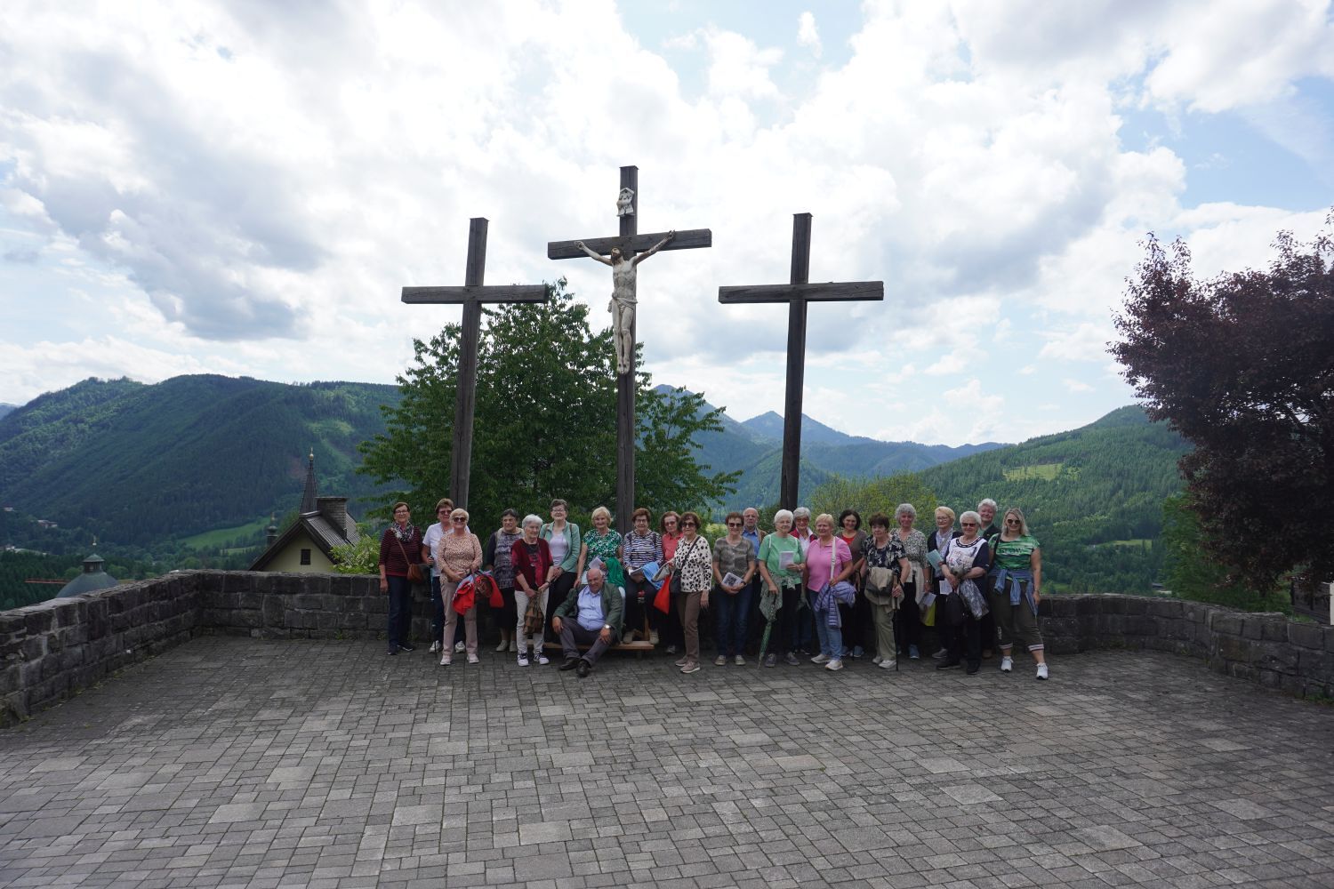 Nach dem stärkenden Mittagessen setzte sich das Wallfahrtsprogramm beim „Heiligen Brunnen“ fort und ging von dort über die Kreuzwegstationen hinauf auf den Kalvarienberg. Von den anfänglichen Regentropfen waren am Nachmittag nur mehr dunkle Wolken übrig geblieben, aber die Sonne zeigte ihre ganze Kraft, sodass der Anstieg für manche zur Herausforderung wurde. Wieder zurück bei der Basilika bliebt aber dann noch Zeit für einen Kaffee oder ein Eis.