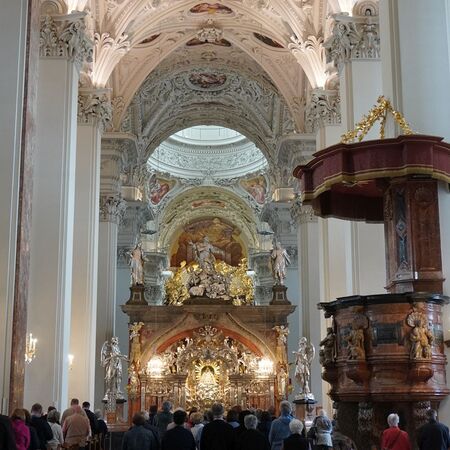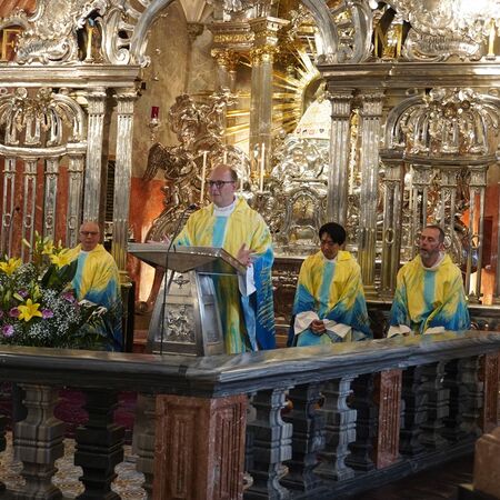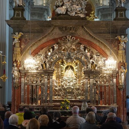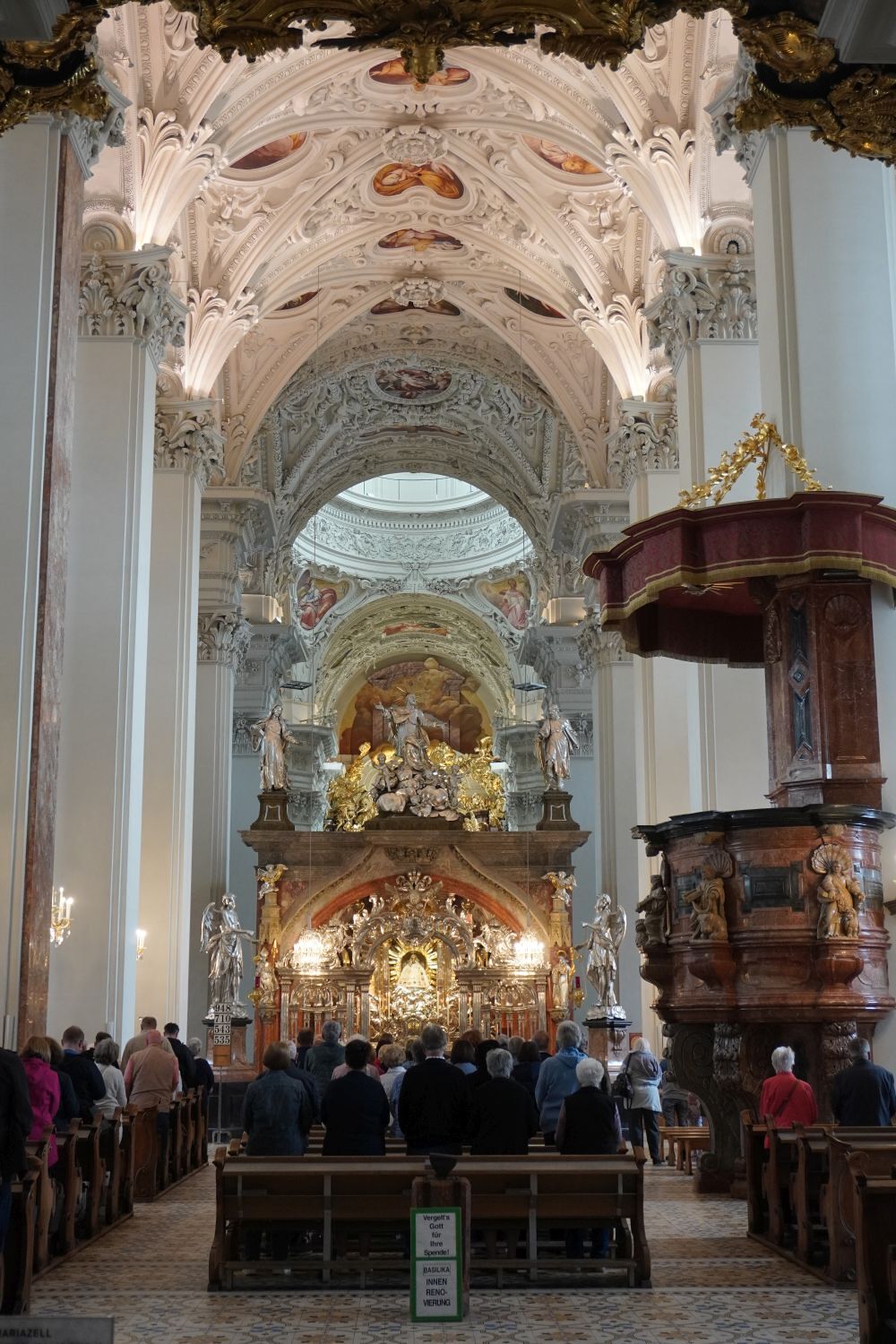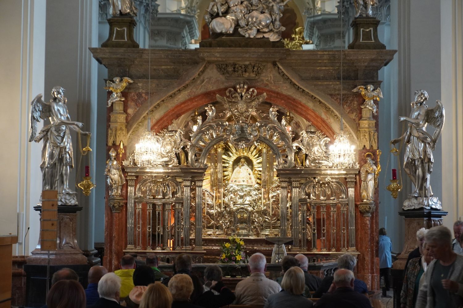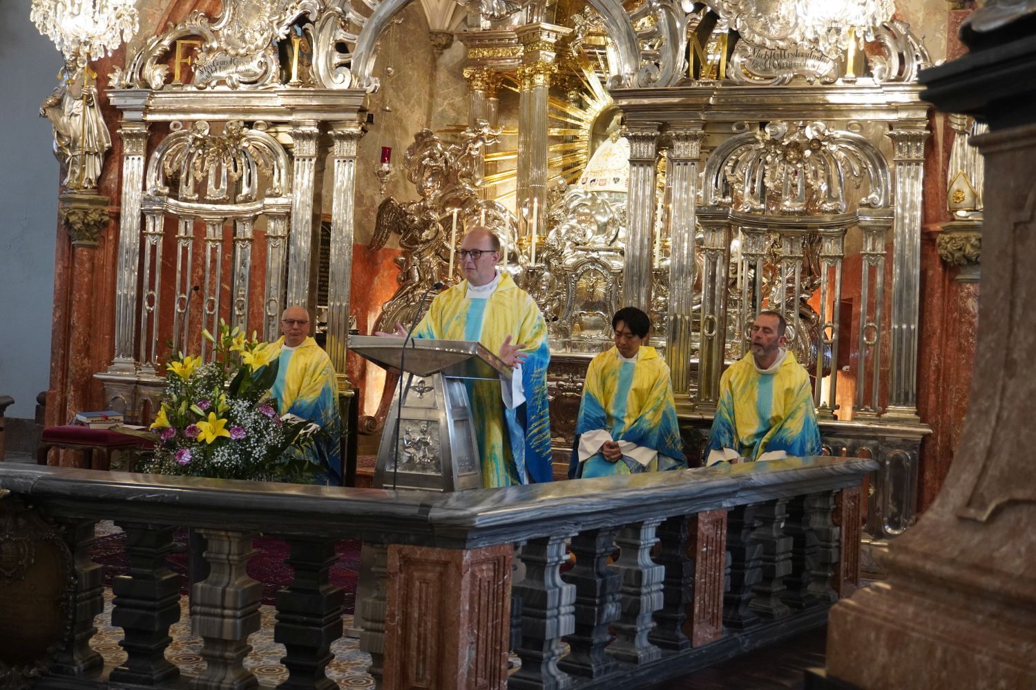 Nachdem die Wallfahrerinnen und Wallfahrer Herzogenburg bei strahlendem Sonnenschein verlassen hatten, erlebten sie unterwegs ein wechselhaftes Wetter – von Regen über Wolken bis hin zu blauem Himmel. In Mariazell angekommen begann es leicht zu tröpfeln, weshalb sich die Gruppe gleich in die Basilika rettete, wo um 10.00 Uhr eine gemeinsame Hl. Messe gefeiert wurde. Dieser stand H. Stephanus vor, es feierte aber auch eine etwa gleich große zweite Wallfahrergruppe aus Grafendorf in der Steiermark mit ihrem Pfarrer Alois Puntigam-Juritsch die Messe mit.