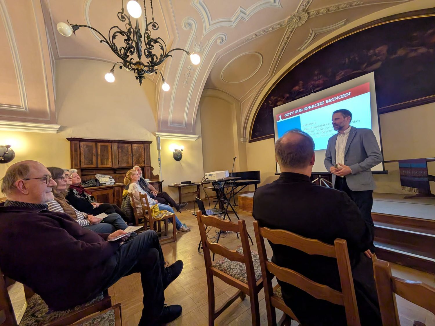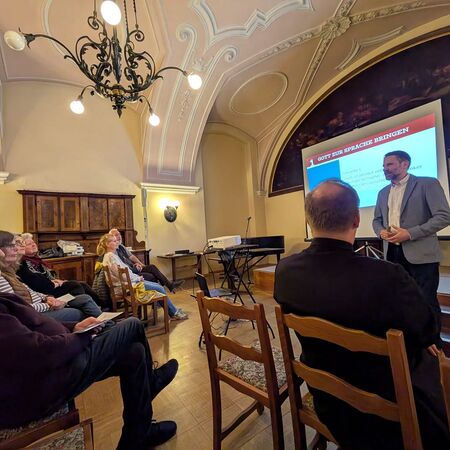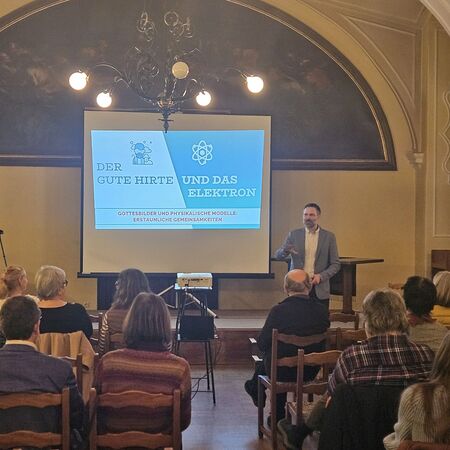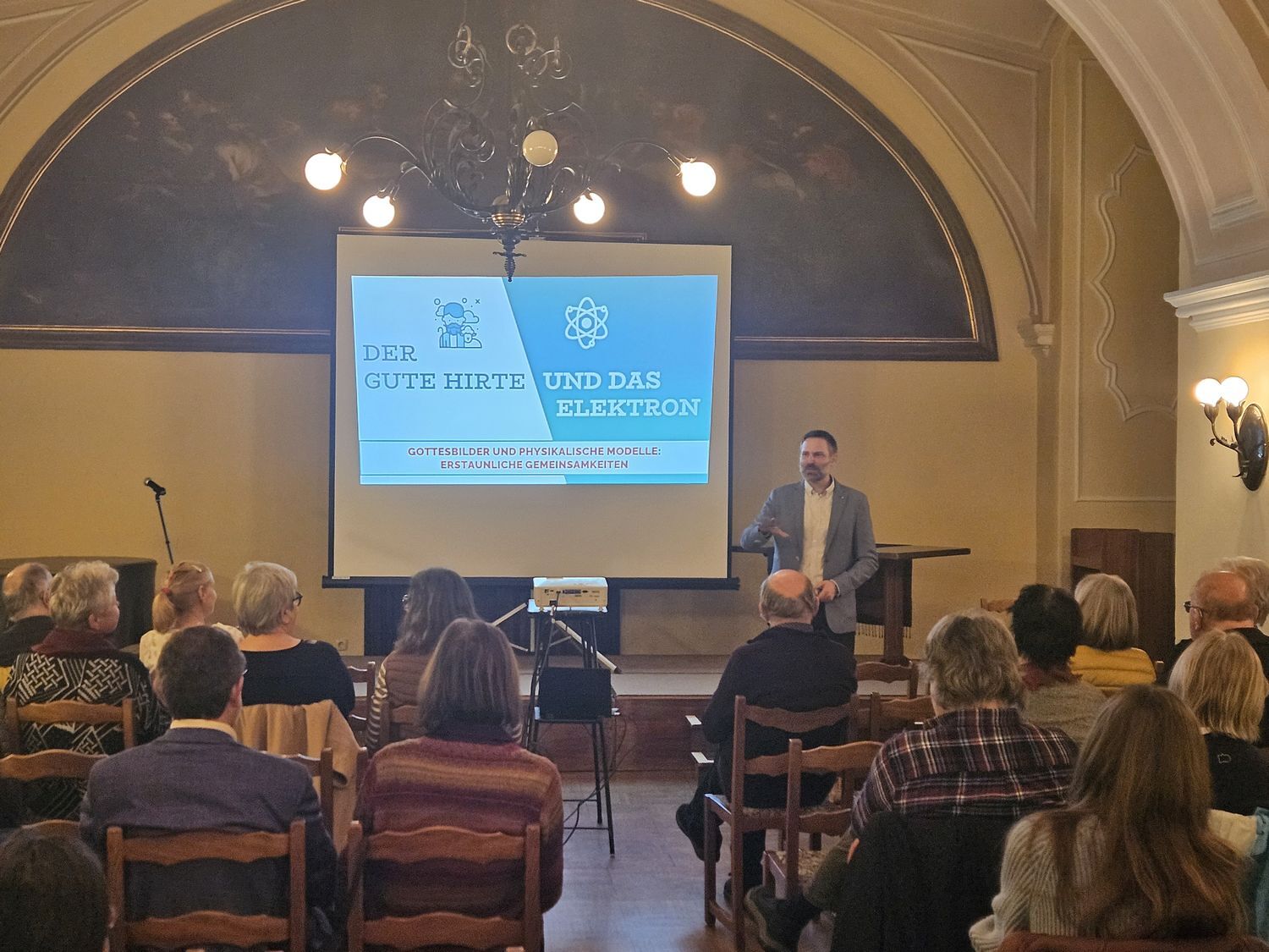 Gespickt mit Anekdoten aus dem Unterricht und praktischen und anschaulichen Beispielen referierte zunächst der Religionslehrer über die verschiedenen Zugänge zu Gott und kam zu der Conclusio, dass wir letzten Endes immer in Bildern von ihm Sprechen. Ob als „guter Hirte“ oder „Vater“ – hier erfolgte ein kurzer Ausflug in den Deutsch-Unterricht – letztlich erfolgt jede Rede von Gott in Form einer Analogie.