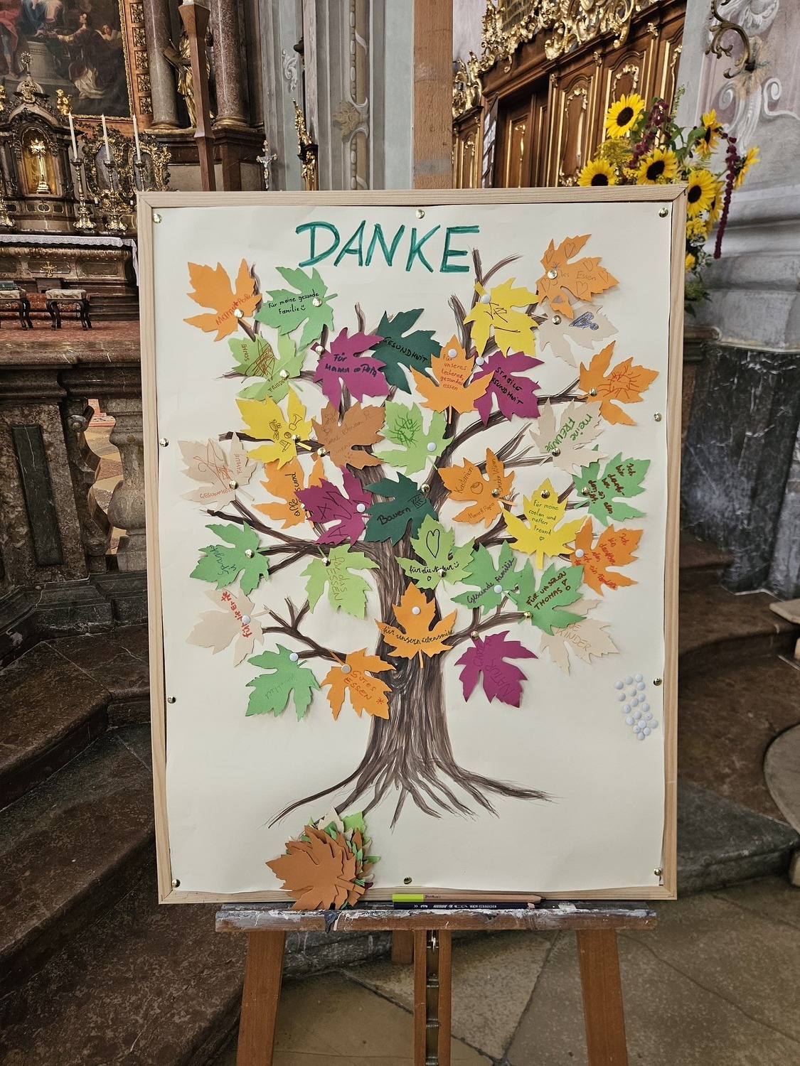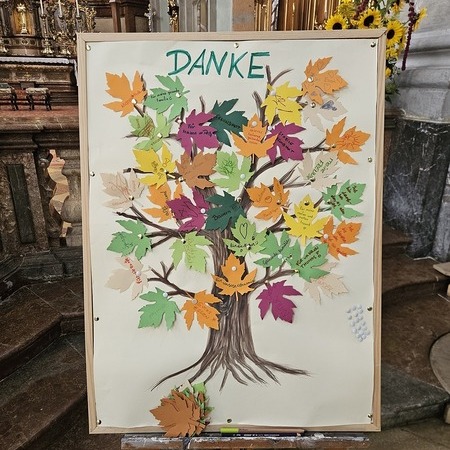 Die vielfältige Bedeutung des Dankes griff nicht nur Pfarrer H. Stephanus in seiner Predigt auf, sondern wurde auch vom Kinderliturgie-Team im Rahmen eines eigenen Wortgottesdienste für die Kinder vertieft. Diese gestalteten gemeinsam einen „Danke-Baum“, auf dem sie alles das in den Blättern sammelten, wofür man „Danke“ sagen kann.
