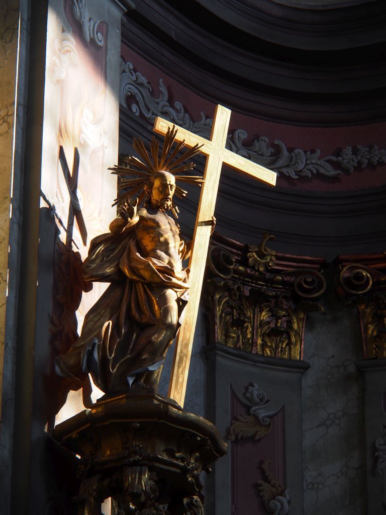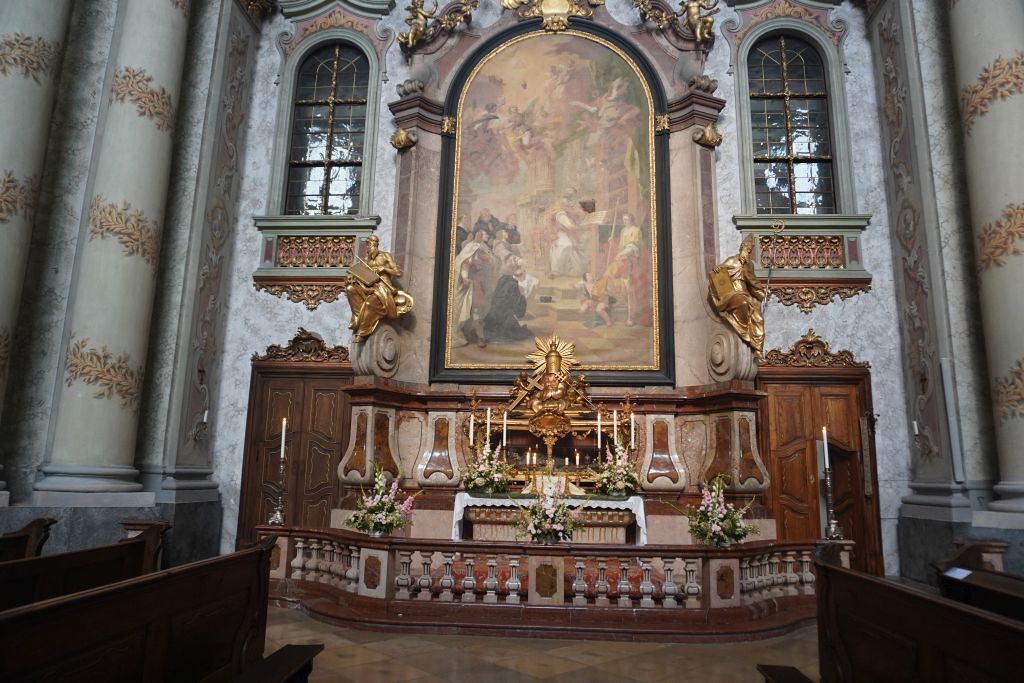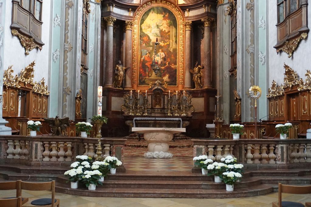 Im weiteren Kirchenraum wird der Gedanke des offenen Himmels fortgeschrieben. Christus hat die Trennung zwischen Himmel und Erde aufgehoben, er steht als triumphierender Erlöser auf der Kanzel. Die Heiligen leiten die Menschen durch ihr Vorbild und ihre Fürsprache zu Gott hin. Auf den Seitenaltären und in den Gemälden des Kirchenraumes werden sie uns gezeigt: Himmel und Erde, Engel und Menschen jubeln Gott dem Herrn zu!