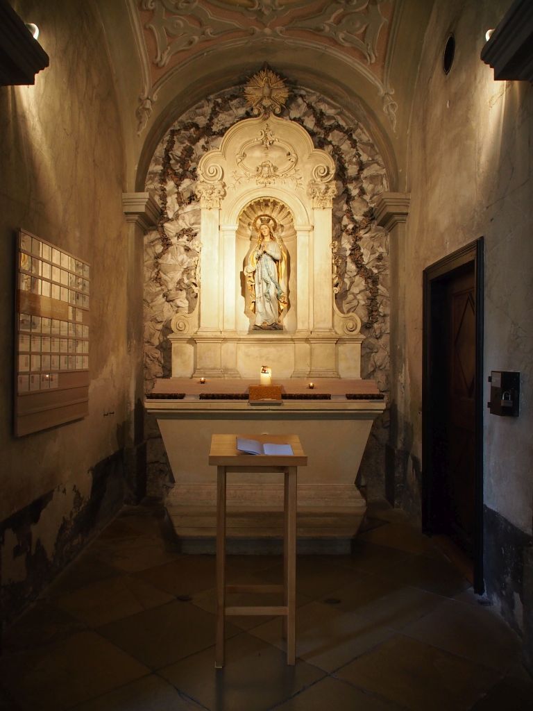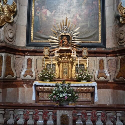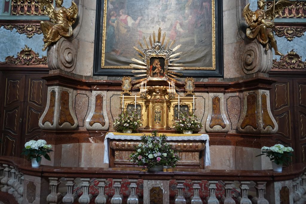 Ergänzt wird diese Komposition durch das Gnadenbild des Stiftes Herzogenburg. Es ist auf dem rechten Seitenaltar zu finden und wurde im 17. Jahrhundert nach dem berühmten Vorbild ovn Lucas Cranach gefertigt. In Herzogenburg trägt dieses Bild den Beinamen „Maria, Hilfe der Irrenden“. Inmitten der überschwänglichen Pracht dieses Kirchenraumes verschafft es der schlichten Botschaft des christlichen Glaubens Gehör: Jesus und Maria – Wange an Wange – das ist der einfache Urgestus der Liebe.